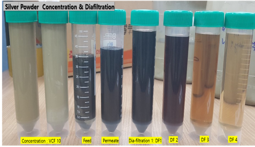 금속입자(Silver Metal Powder) PROJECT ISSUE BEBEFIT RESULT Metal Powder(Silver) Concentration & DiaFiltration Silver Powder의 농축 및 정제(Washing) 회수율 증가 / 순도향상(DF 4회) : 20mS/cm↑ → 400uS/cm↓농축율 향상 : VCF10배 이상 Membrane : 0.05㎛, PTFE / Flux : 90~110LMH PHOTO Basic Material, Nano Material21 bktNovember 13, 2020품질향상, 공정단순화 Facebook0 Twitter LinkedIn0 Reddit Tumblr Pinterest0 0 Likes