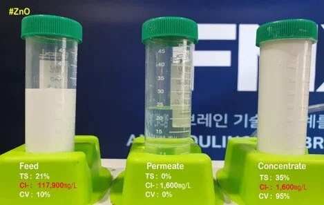 산화아연(ZnO Slurry) PROJECT ISSUE BEBEFIT RESULT ZnO Slurry(Zinc Oxide) Concentration & DiaFiltration Zinc Oxide 농축 및 정제(Washing) 농축율(회수율) 향상 : VCF 4.0 (75%)품질향상(Cl-) : 11.7% → 0.16%(DF6회) Membrane : 0.05㎛, PTFE / Flux : 200~460LMH PHOTO Basic Material, Nano Material21 bktNovember 13, 2020품질향상, 공정단순화 Facebook0 Twitter LinkedIn0 Reddit Tumblr Pinterest0 0 Likes