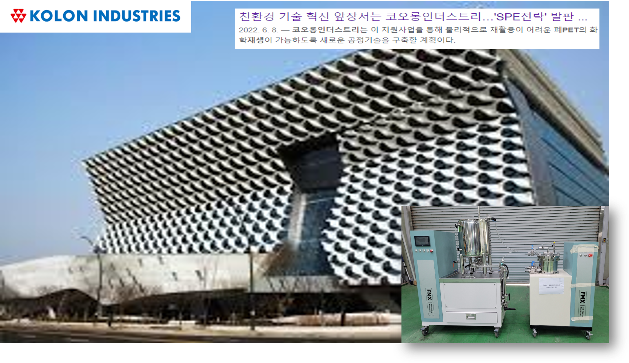 코오롱인더스트리 미래기술원은 FMX-B5모델을 활용하여 올해 연말까지 친환경 폴리에스테르(PET)재생기술을 공정을 완성하고 2025년 본격적인 재생PET를 양산화할 예정이다. .