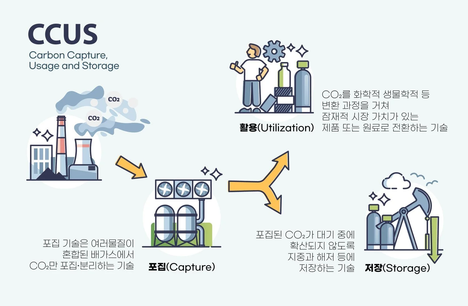 - 이에 따라 탄소 중립을 달성하기 위한 방안으로 CCUS기술의 중요성이 대두되고 있습니다. CCUS는 말 그대로 탄소를 포집(Capture), 활용(Utilization) 또는 저장/격리(Storage/Sequestration)하는 기술로 이는 배출되는 탄소를 활용하여 다른 에너지원으로 사용 가능하다는 점에서 각광받고 있습니다. 2050 국가 탄소중립 시나리오에서도 탄소 배출량 0을 위한 대안으로 CCUS 기술을 소개하고 있습니다.